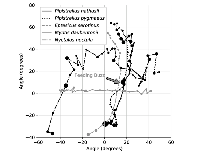 Flight path of a N. noctula catching an insect. The recording showed a feeding buzz, and a directional analysis of the feeding buzz showed the deviation in the bat's flightpath as it swerved to catch it's prey.